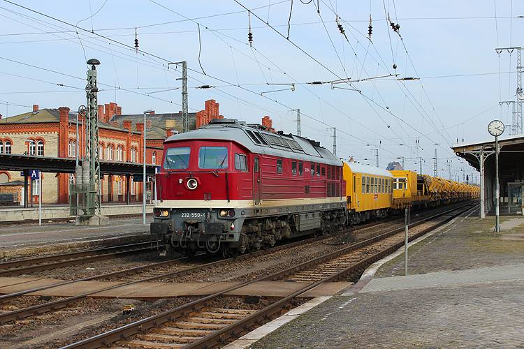Dem verspäteten RE folgte die DGT 232 550 mit einem Bauzug, dessen Reise in Richtung Wittenberge weiterging, 01.03.2014. |
