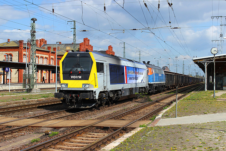 Die NBE ist zwar Stammgast in Stendal, aber mit einem gemischten Doppel aus der Maxima 264 002 und dem alten DB-Diesel 225 006 sah ich sie am 13.04.2014 zum ersten Mal. Sie waren wie gehabt mit einem E-Wagenzug in Richtung Wittenberge auf der Durchreise. |
