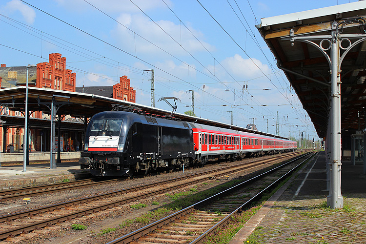 Am Ostermontag verkehrte der neue IRE Berlin - Hamburg zum ersten Mal als IRE 18598 im Sonntags-Nachmittagsplan, wo man ihn in Stendal bestens im Licht aufnehmen kann. Die schwarze ES64U2-070 von MRCE ist von DB-Regio extra für das tägliche Zugpaar angemietet worden, 21.04.2014. |