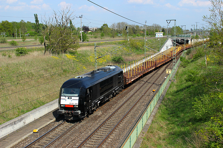 ER20-005 von MRCE war am 25.04.2014 mit einem leeren Holzzug aus Niedergörne gekommen und setzte nach dem Kopfmachen im Güterbahnhof seine Fahrt in Richtung Oebisfelde fort. |