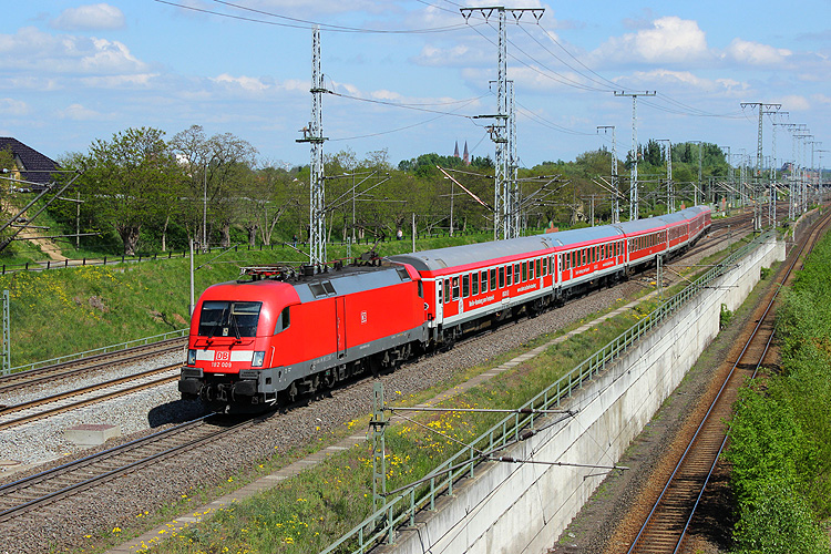 Am 27.04.2014 war die Stammlok des IRE wohl nicht verfügbar, so das die rote 182 009 mit dem IRE 18598 nach Hamburg unterwegs war. |