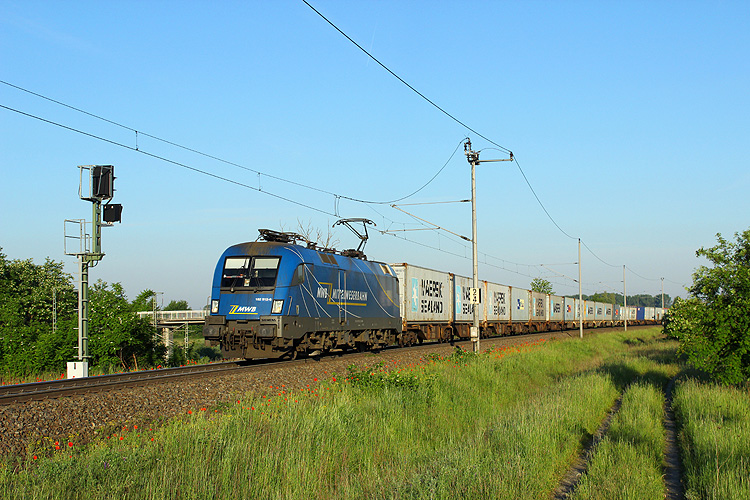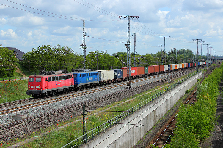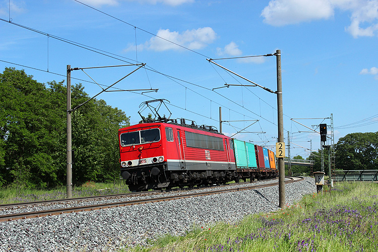 Da die Salzwedeler Strecke am 10.05.2014 mal wieder überlastet war, mußte der EGP-Containerzug nach Hamburg ausnahmsweise über Wittenberge weiterfahren, gezogen von 140 853 + 824. |