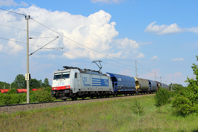 Mit einem Cerealienzug fährt 186 238 der LTE in Richtung Salzwedel aus, 20.05.2014. |