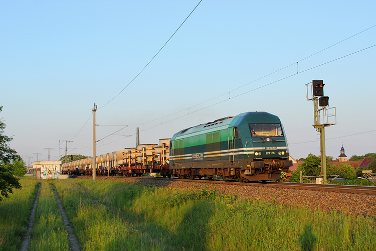 Der Abends verkehrende Enerconzug Magdeburg Rothensee - Emden fährt gezogen von 223 156 in Richtung Salzwedel, 20.05.2014. |