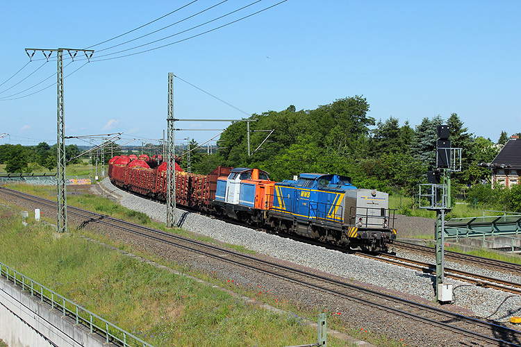 Ein gemischtes Doppel aus Ost- und West V 100, der MWB V 1702 und der NBE 212 297, kamen am 06.06.2014 mit einem Holzzug aus Richtung Wittenberge und fuhren in Richtung Magdeburg durch. |