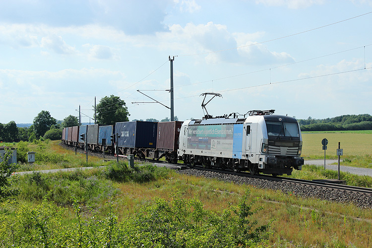 Mit dem stark verspäteten Containerzug Hamburg - Hof rollte am Nachmittag des 12.06.2014 die für die EVB fahrende Railpool 193 806 aus Richtung Salzwedel kommend nach Stendal herein. |