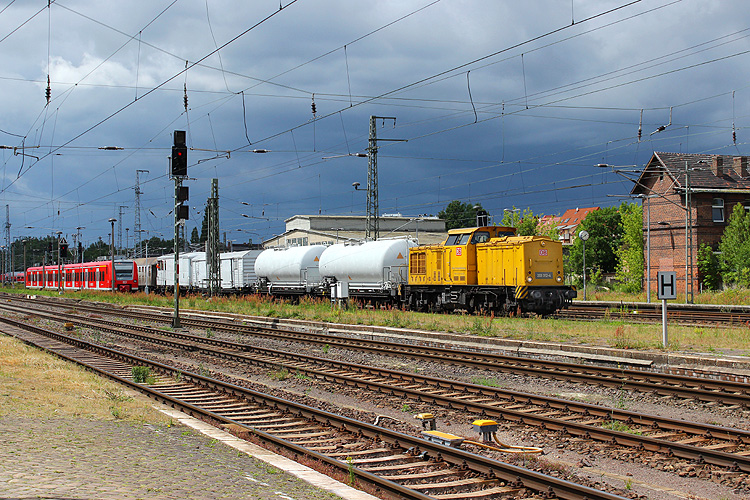 Am 22.06.2014 war der Unkraut-Spritzzug im Raum Stendal im Einsatz, hier kommt er gerade aus Richtung Salzwedel, gezogen von 203 312. |