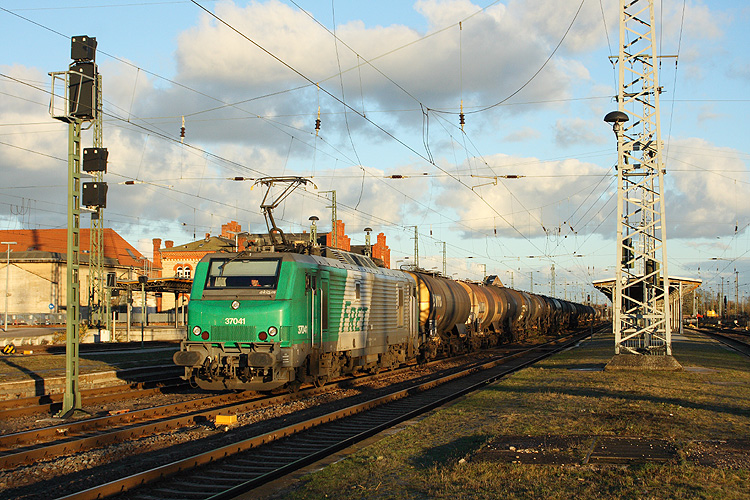 Die Französin 37041 von akiem durchfuhr am 24.11.2013 mit einem Kesselzug aus Richtung Magdeburg kommend den Stendaler Bahnhof in Richtung Salzwedel. |