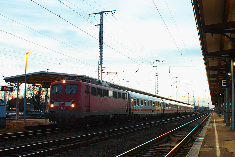 Der IC 2238 / 2239 "Warnow" wird im neuen Fahrplan von der Baureihe 113 / 115 gefahren. 115 205 ist hier mit dem IC 2239 Rostock - Leipzig am Gleis 4 zum Stehen gekommen, 23.12.2013. |