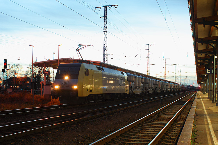 Der dem IC folgende Zementzug mit 152 196 der ITL mußte kurz darauf ebenfalls einen Halt einlegen, da ein kurz zuvor ausgefahrener Kalileerzug den Blockabschnitt nach Heeren noch nicht geräumt hatte. |