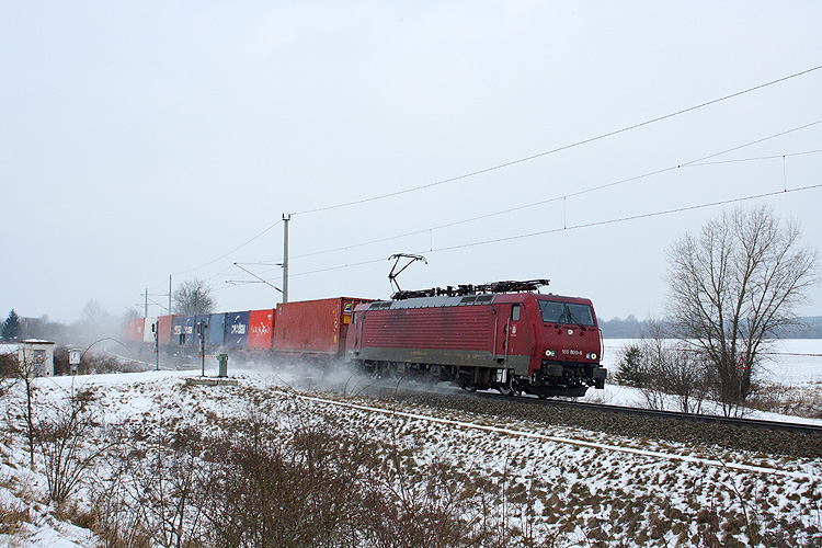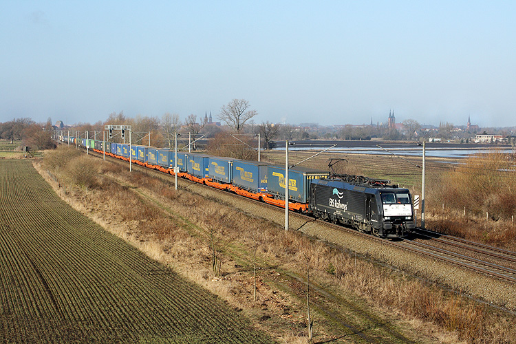 Das Einzelstück der MTEG 189 800 fährt mit einem Containerzug aus Hamburg kommend auf der Salzwedeler Schiene nach Stendal herein, 22.02.2013. |