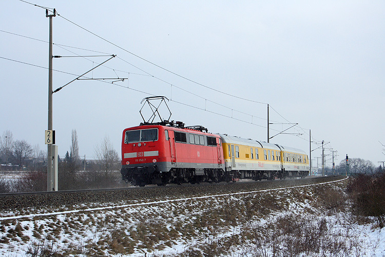 Im Februar 2013 war 111 052 mit einem Meßzug kreuz und quer auf dem ehemaligen Reichsbahnnetz unterwegs, wo diese Baureihe sonst nie zum Einsatz kommt. Hier schiebt sie mit ihren Meßwagen aus Richtung Salzwedel kommend in Richtung Bahnhof, 22.02.2013. |
