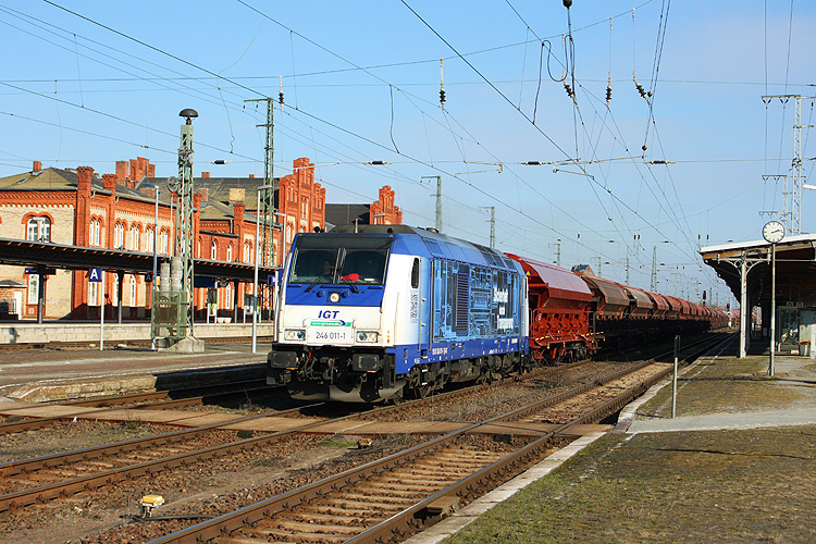 246 011 der IGT ist derzeit für Raildox unterwegs. Am 02.03.2013 durchfuhr sie aus Richtung Magdeburg kommend Stendal mit einem Düngerzug nach Poppendorf. |