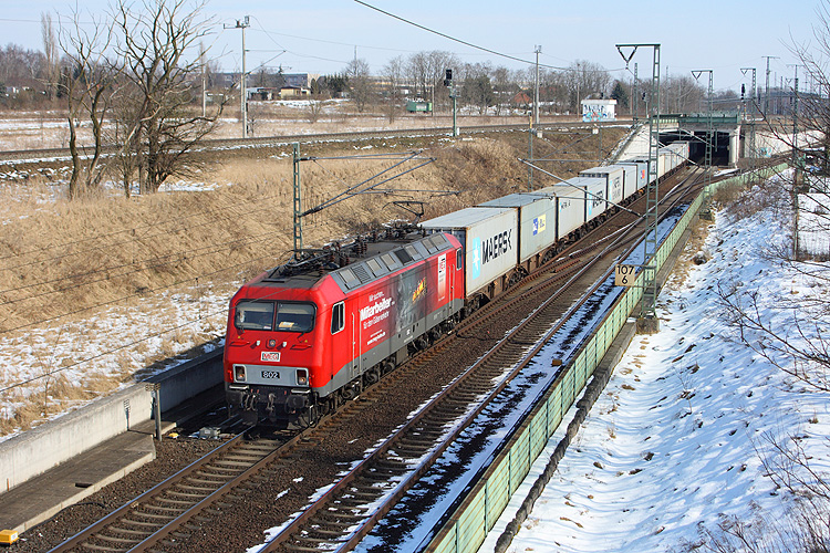 MEG 802, die einstige 156 002 der DB, passierte am 16.03.2013 mit einem Containerzug nach Bremen Stendal. Dieser kam aus Richtung Magdeburg und fuhr über Oebisfelde weiter. |