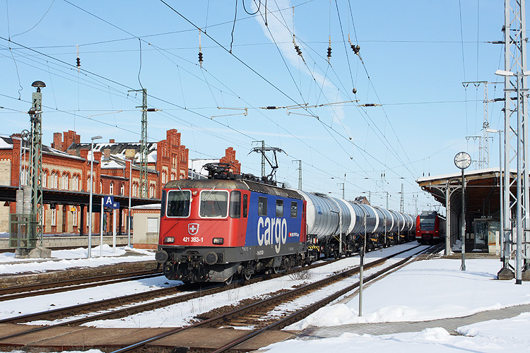 SBB-Cargo 421 383 durchfuhr am 23.03.2013 mit einem Kesselzug in Süd-Nord-Richtung Stendal. |