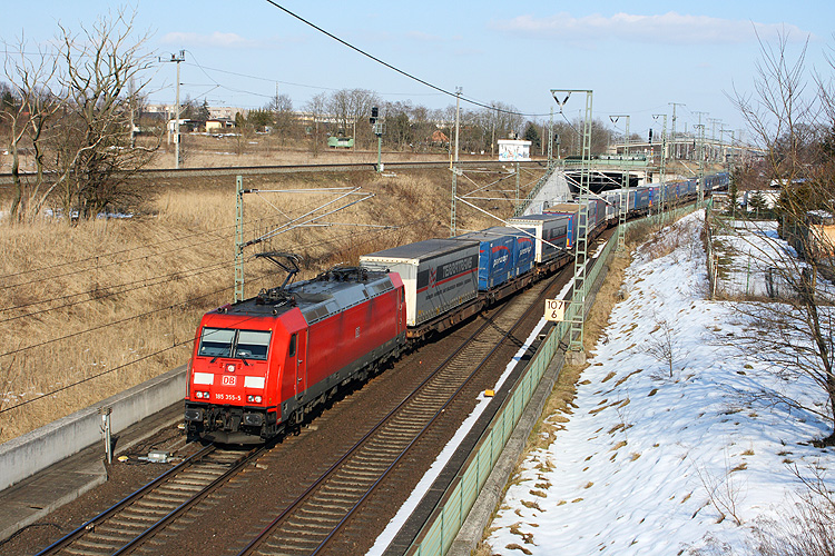Der samstägliche EGP-Containerzug durchfährt Stendal in Süd-Nord-Richtung, Zuglok war am 02.03.2013 139 285. |