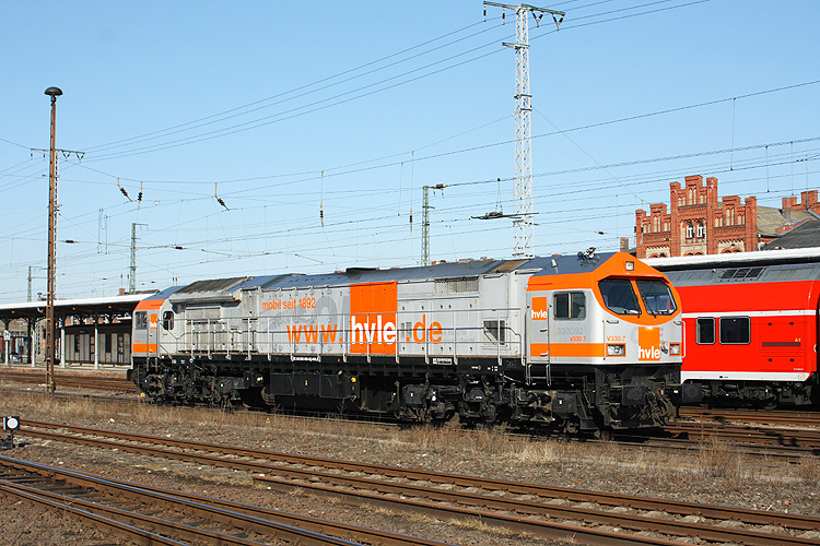 Der neue HVLE-Tiger V 330.7, einst als 330092 für die OHE fahrend, war am 07.04.2013 in Stendal zu Gast. Er kam mit einem E-Wagenzug aus Richtung Magdeburg und machte hier Kopf, um dann in Richtung Rathenow weiterzufahren. |