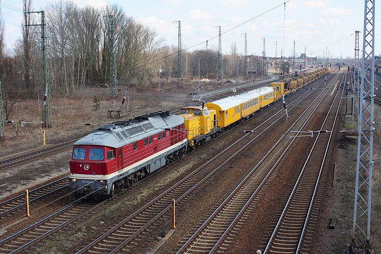 Auch 232 550 der DGT durchfuhr am 07.04.2013 Stendal, sie war mit einem langen Bauzug, in dem auch noch eine gelbe V 100 mitgeführt wurde, aus Richtung Magdeburg kommend in Richtung Wittenberge unterwegs. |