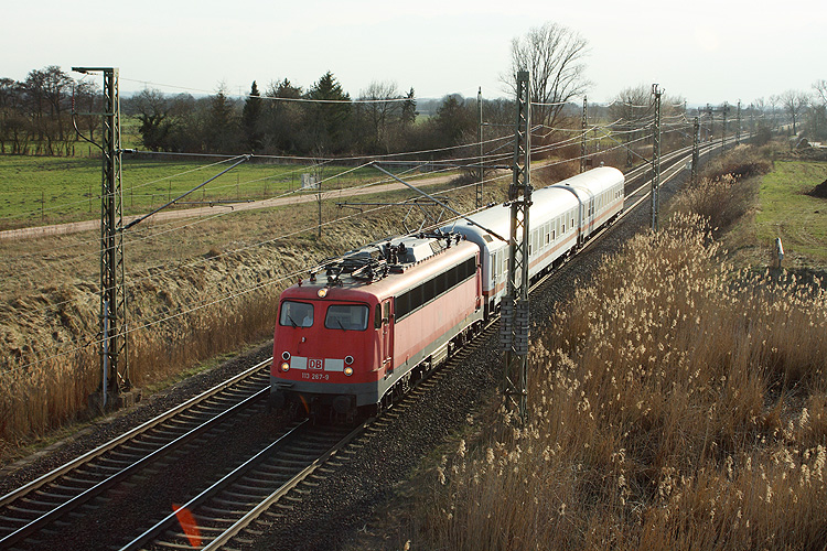 113 267 durchfuhr am 15.04.2013 mit einer Reisezugwagen-Überführung Stendal von West nach Ost. |