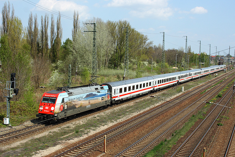 Die Werbeloks des Fernverkehrs lockern den sonst recht eintönigen Personenverkehr etwas auf, hier 101 118 "Packendes Südafrika" mit dem IC 144 Berlin - Amsterdam am 05.05.2013. |