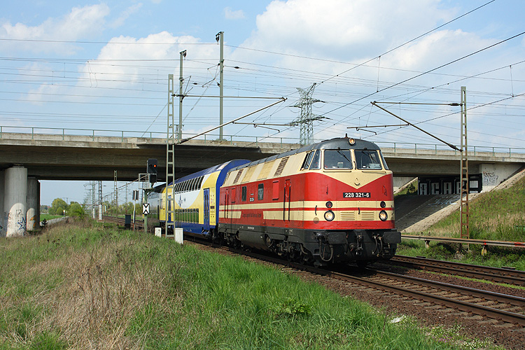 Sonntags fährt in diesem Jahr oft ein ganz besonderer Zug über Stendal, ein mit der CLR 228 321 bespannter Metronom! Derzeit sind viele Doppelstockwagen des Metronom zur Untersuchung fällig, die in Halberstadt durchgeführt wird. Die CLR übernimmt die Überführung der Wagen von Uelzen nach Halberstadt, wie hier von mir am 05.05.2013 an der Brücke der Stendal-Umfahrung der Schnellfahrstrecke aufgenommen. |