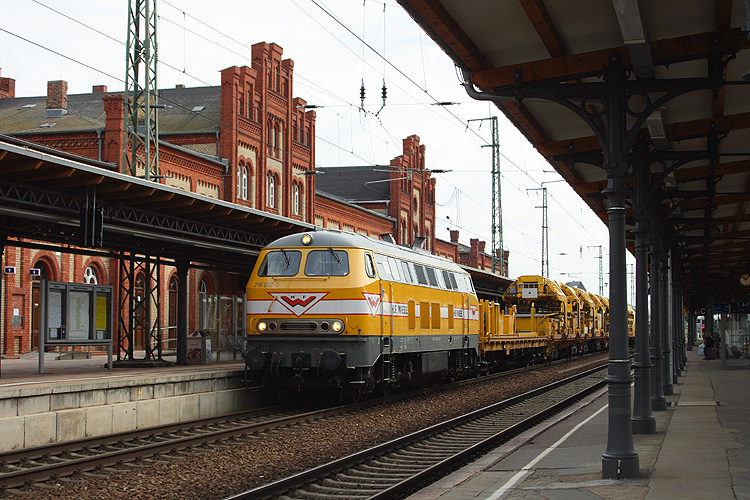 Mit einem Bauzug durchfuhr die Wiebe 216 012 vorbei am Hausbahnsteig Stendal von Ost nach West, 10.05.2013. |