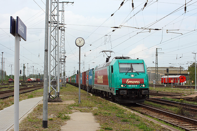 Die Emons 185 612 ist seit dem Frühjahr 2013 Stammgast in Stendal, hier bremst sie mit ihrem aus Hamburg kommenden Containerzug zu einem Personalwechselhalt ab, 10.05.2013. |