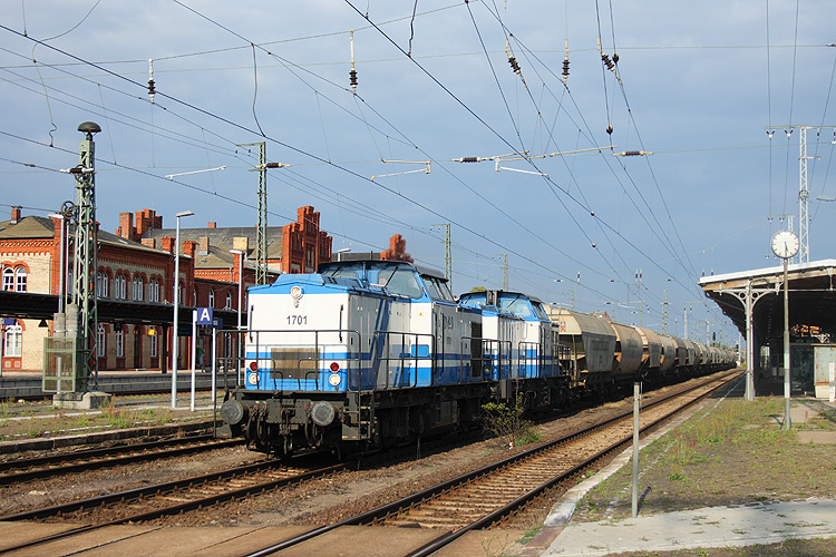 Mit einem Getreidezug fuhren am 11.08.2013 die D&D 1701 + 1401 aus Richtung Magdeburg kommend in Richtung Wittenberge durch. |
