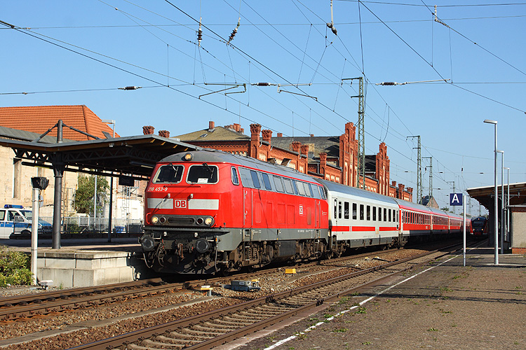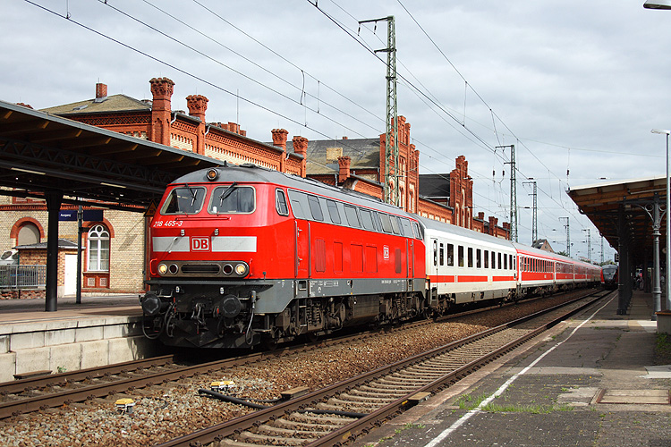 Am Tag der deutschen Einheit 2013 war 218 453 für die Beförderung des "Stammstreckenshuttles" IC 18649 Berlin - Hannover zuständig, unterstützt von 218 458 am Zugende. |