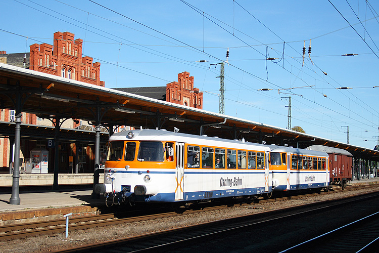 Auf einer Sonderfahrt von Waren/Müritz nach Bielefeld kamen am 29.09.2013 die Triebwagen 302 027 + 051 der Osning-Bahn über Rathenow nach Stendal und legten vor der Weiterfahrt in Richtung Oebisfelde am Gleis 3 eine kurze Pause ein. |