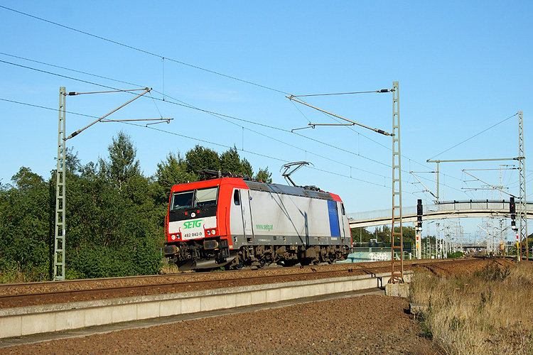 Am selben Nachmittag fuhr auch noch die für die SETG fahrende 482 042 von SBB-Cargo solo nach Borstel, um einen Leerzug abzuholen. |