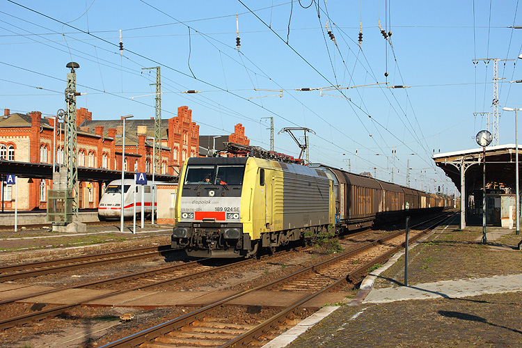 Im September/Oktober 2013 lief beim Güterverkehr auf der Nord-Süd-Strecke nur sehr wenig, da wegen Bauarbeiten am Abzweig Glindenberg die übliche Führung der Güterzüge über Magdeburg-Rothensee nicht möglich war. Nur sehr wenige Züge durften über die Reisezuggleise durch den Magdeburger Hbf von und nach Stendal fahren. Einer davon war der leere Zellstoffzug von Pordenone (Italien) nach Rostock Seehafen, wie hier mit Dispolok 189 924 am 03.10.2013 aufgenommen. |