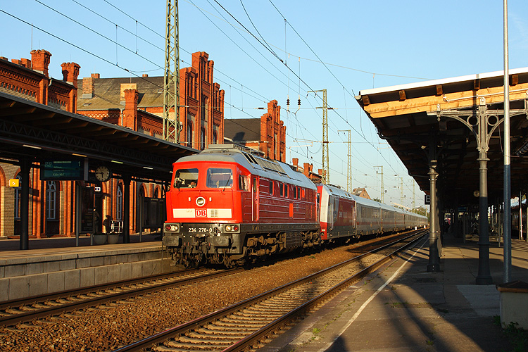 Der normalerweise über Brandenburg-Magdeburg-Helmstedt fahrende IC 2954 Berlin - Köln wurde wegen einer Oberleitungsstörung am 03.10.2013 über Stendal - Wolfsburg umgeleitet. Da die Schnellfahrstrecke zu jenem Zeitpunkt nach dem Deichbruch bei Fischbeck und der anschließenden Überflutung durch das Juni-Hochwasser der Elbe noch immer nicht betriebsbereit war, schleppte 234 278 den IC samt seiner eigentlichen Zuglok 101 080 über die nicht elektrifizierte Stammbahn nach Stendal. |