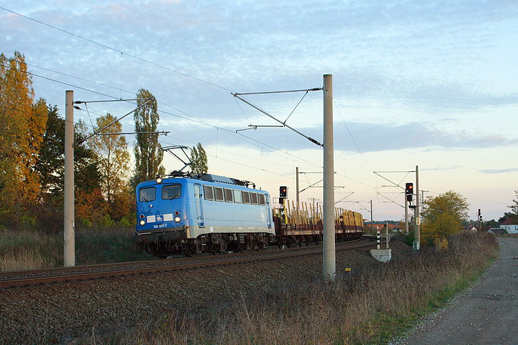 Mit einer Fuhre Holz für Niedergörne verließ am Abend des 26.10.2013 die Press 140 037 Stendal zum Umspannbahnhof Borstel. Zuvor war die Lok mit dem Zug aus Lübeck über Salzwedel nach Stendal gefahren. |