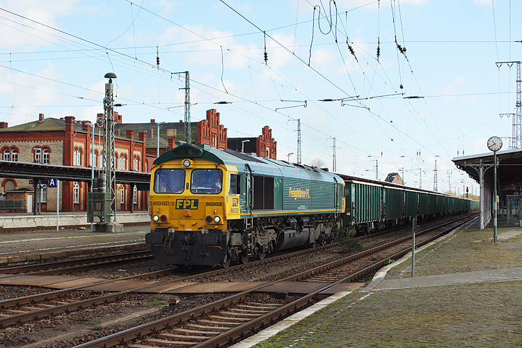 Mit einem Kieszug aus Richtung Magdeburg kommend passierte die FPL 66003 am 27.10.2013 Stendal in Richtung Wittenberge. |