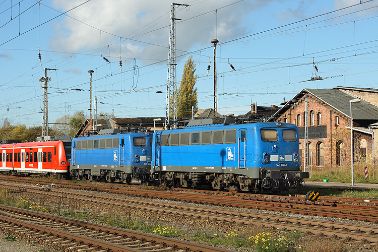 Durch die Bauarbeiten für die Verlängerung des Bahnsteigtunnels zur Lüderitzer Straße war das Abstellgleis für die Press-Loks ab Frühjahr 2013 nicht mehr erreichbar, so das man sich neue Abstellplätze suchen mußte. Während man im Sommer die Loks zumeist im Güterbahnhof parkte, wurde im Herbst auch das ehemalige Bahnbetriebswerk zum Abstellen genutzt, was am 27.10.2013 140 037 und 140 042 demonstrierten. |