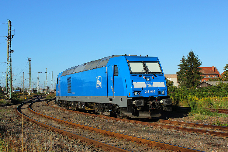 285 101, eine der neuen blauen Diesel-Traxxe der Press stand am 27.09.2015 an der Zufahrt zum Alstom-Werk abgestellt. |