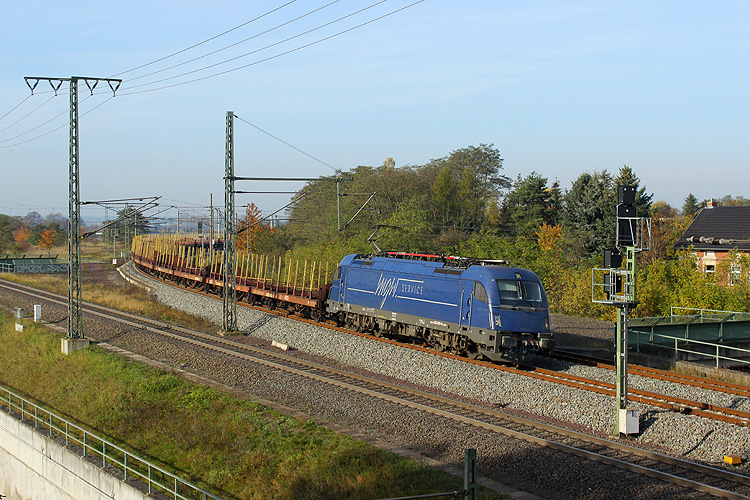 183 500 von MGW ist oft im Holzzugdienst für die SETG im Einsatz. Am 01.11.2015 brachte sie einen leeren Holzzug von Borstel nach Frankfurt/Oder. |