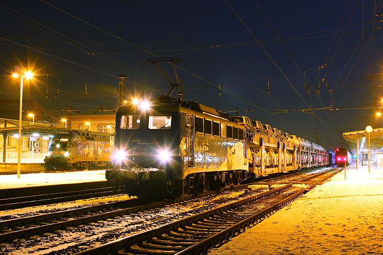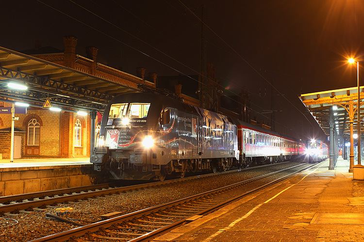 Eine Woche lang gab es im Januar 2016 sogar richtiges Winterwetter mit Frost und Schnee. So wartete am Abend des 21.01.2016 die EVB 140 761 mit dem BLG-Zug Falkenberg - Bremerhaven auf Weiterfahrt in Richtung Wittenberge, während am Gleis 1 der IRE 4272 Berlin - Hamburg mit der "BUGA" 182 013 einen Halt einlegte. |