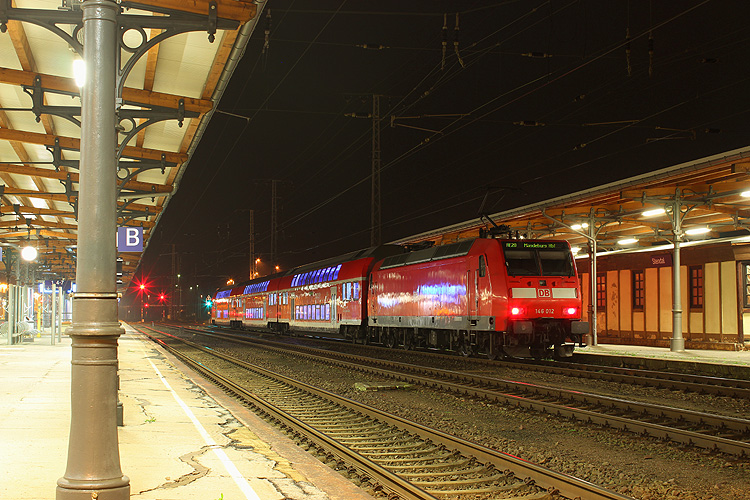 Nun stehen die 146'er auch im RE-Dienst zwischen Uelzen und Magdeburg im Einsatz, wie hier 146 012, die mit dem RE 17667 einen kurzen Halt im Gleis 4 einlegte. Noch sind die beiden Inselbahnsteige im Zustand der Dampflokzeit, sie sollen aber bald modernisiert werden. |