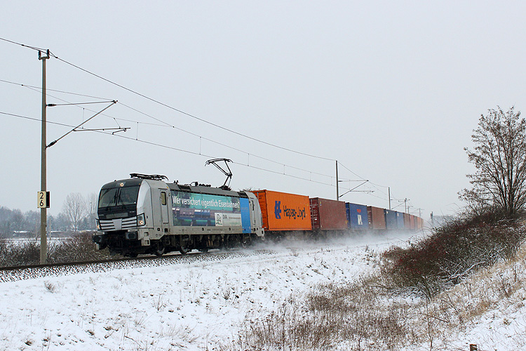 Am Tag der heiligen drei Könige gab es den ersten kleinen Wintereinbruch zu vermelden, 193 806 der EVB durchfuhr mit dem Containerzug Hof - Hamburg den Stendaler Bahnhof, 06.01.2016. |