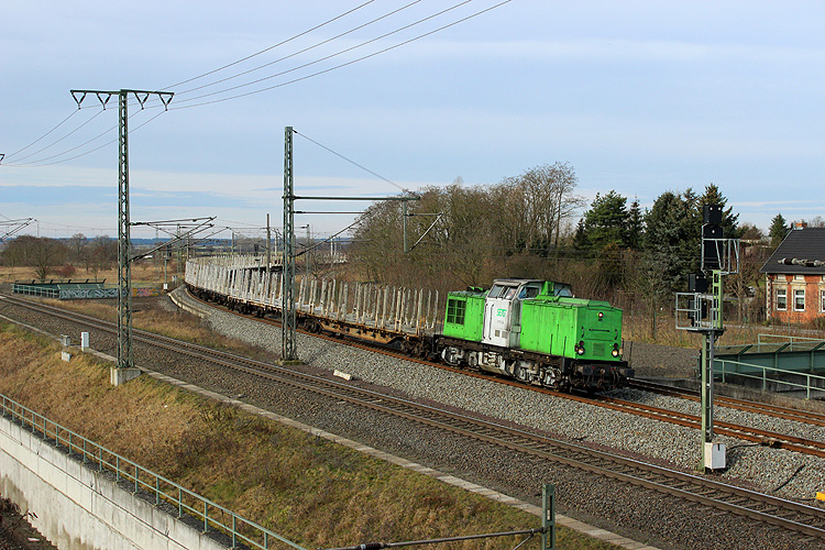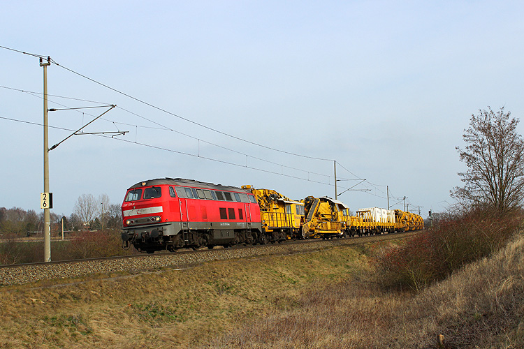 Da mal wieder zwischen Stendal und Salzwedel gebaut werden sollte, brachte am 28.02.2016 die für die BEG fahrende 225 133 der STGBS einen Bauzug zum Einsatzort. |