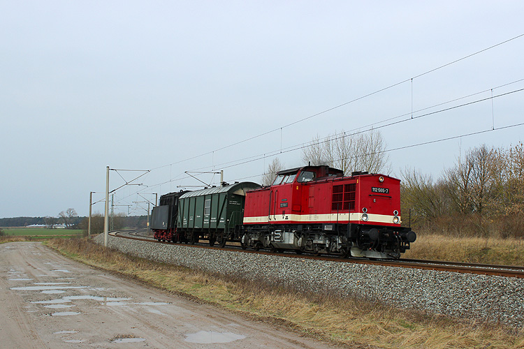 112 565 der Press hatte am Vortag die Schweriner Museumslok 91 134 aus Sachsen heimwärts gebracht und fuhr am 19.02.2016 mit den Begleitfahrzeugen zurück nach Glauchau. Der Zusatztender von 01 0509 diente bei der Überführung der Dampflok als Wasservorrat. |