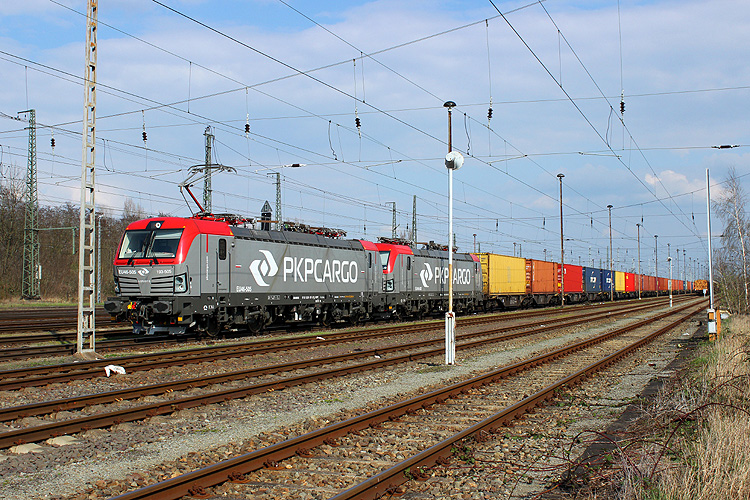 Gleich zwei der nagelneuen Vectron-Lokomotiven der PKP-Cargo hingen am 06.04.2016 vor dem Containerzug Malaszewice - Rheinhausen, 193 505 und die abgebügelte 193 502. |