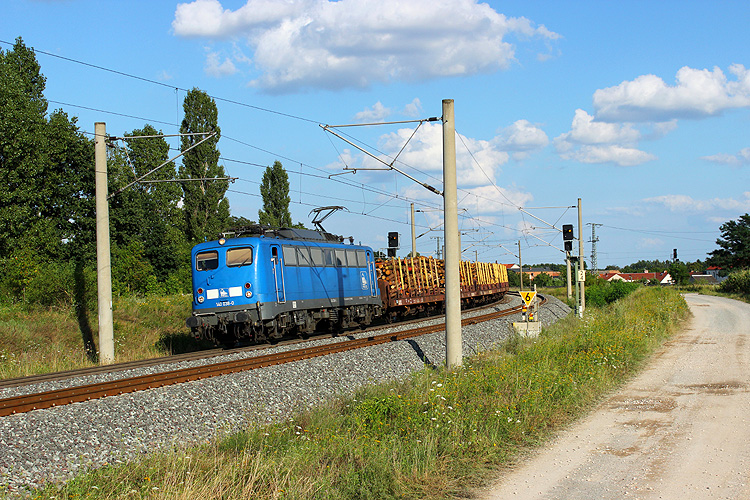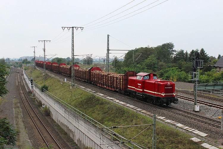 140 041 der Press hat einen leeren Holzzug aus Borstel abgeholt und fährt mit diesem nun in Richtung Berlin, 05.10.2014. |