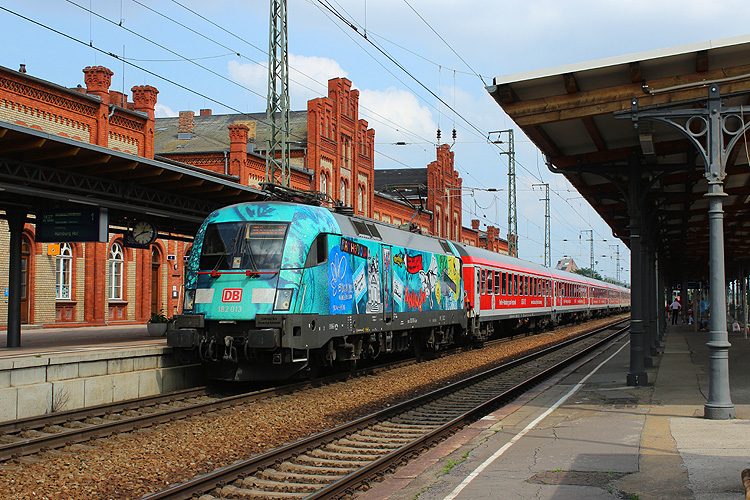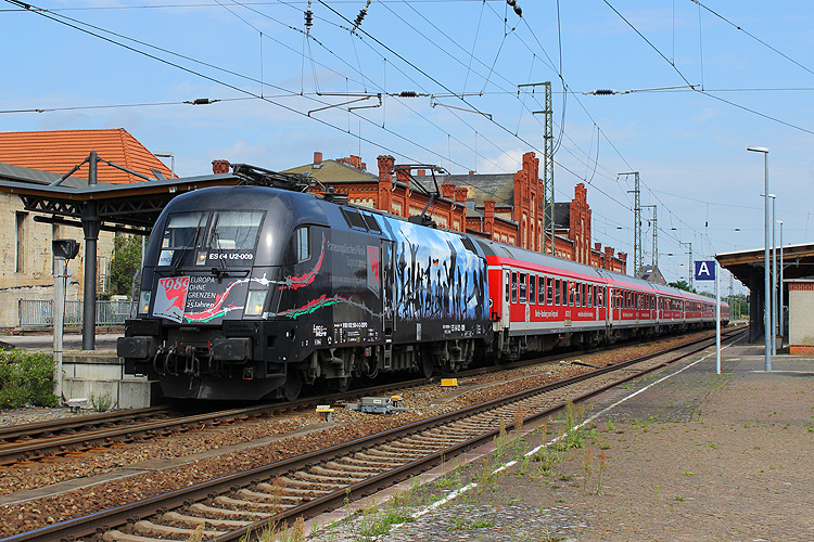 Endlich eine neue Stammlok für den IRE Berlin - Hamburg und dann auch noch eine richtig schicke - 182 509 "Europa ohne Grenzen seit 25 Jahren" hält mit dem IRE 18598 am Bahnsteig 1, 03.08.2014. |