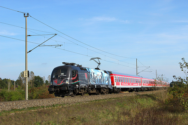 Stammlok 182 509 verläßt mit dem IRE 18598 Berlin - Hamburg Stendal in Richtung Salzwedel, 28.09.2014. |