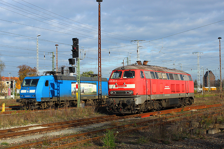 Am 08.11.2014 stand die Bahnbau 218 261 neben der Press 145 023 in Stendal abgestellt. |