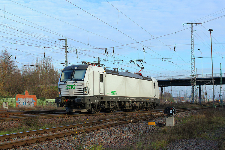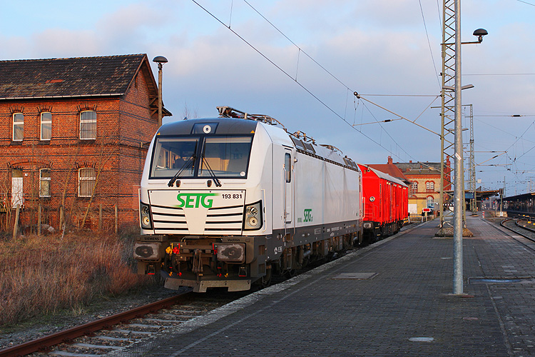 Der SETG-Vectron 193 831 fuhr am Nachmittag des 23.11.2014 nach Borstel, um dort einen leeren Holzzug nach Rostock-Bramow zu bespannen. |