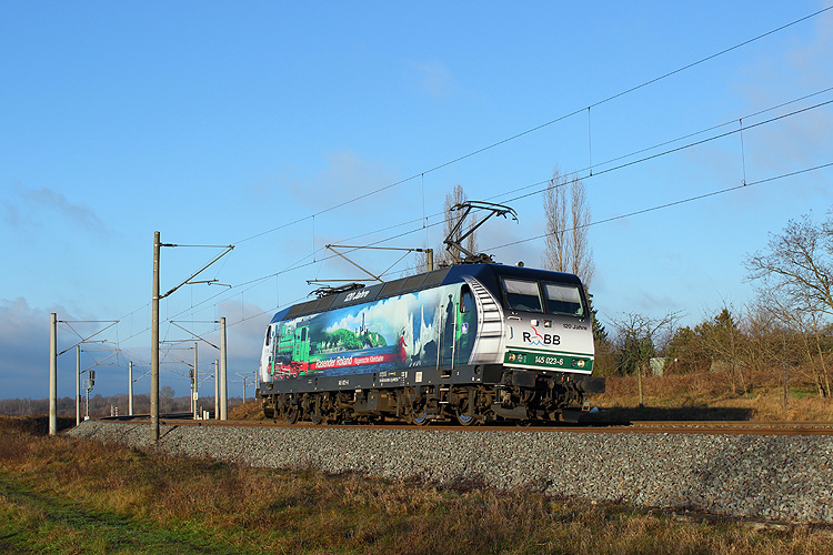 Zum Jahresende 2014 bekam 145 023 der Press neue Werbefolien spendiert. Sie macht nun ein Jahr lang auf den 120.Geburtstag der Rügener Kleinbahn "Rasender Roland" aufmerksam. Am 2.Weihnachtsfeiertag 2014 holte sie den Holzzug aus Rostock-Bramow ab und brachte diesen nach Borstel. Danach ging es wieder zum Abstellen nach Stendal. |